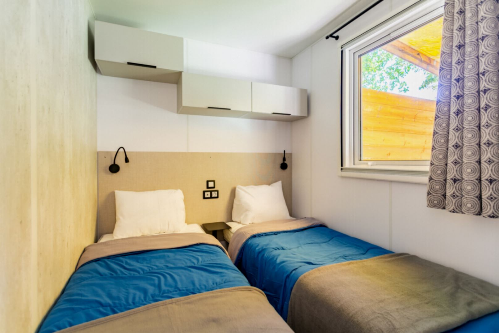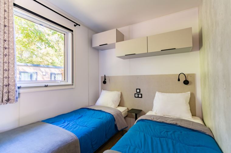 Coin nuit : une chambre avec 1 lit double (140X190), deux chambres avec 2 lits simples (80×190) côte à côte, oreillers et couettes fournis.