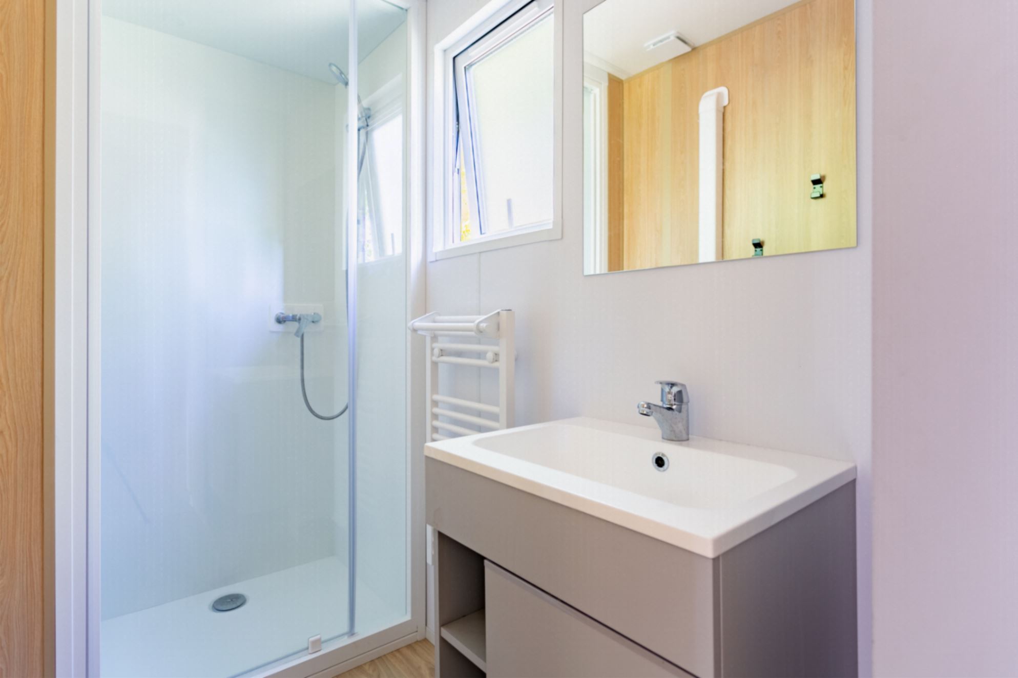 Sanitaire : salle d’eau avec douche, lavabo et WC séparé.
